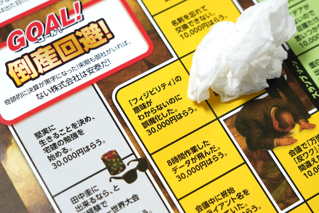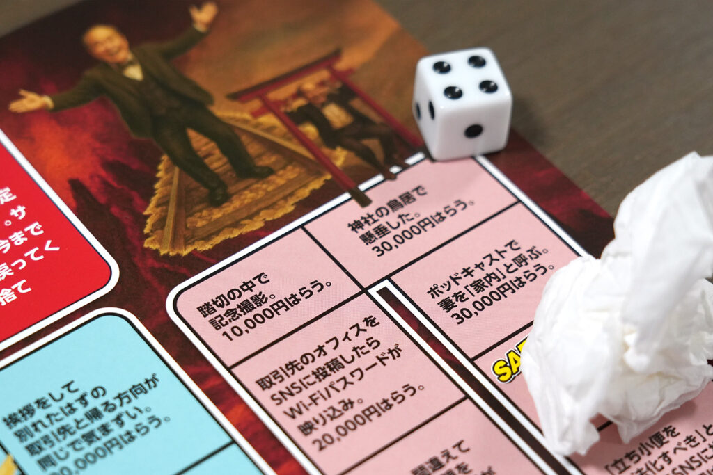 またこのゲームは、仏教で説かれている6つの迷いの世界「六道」になぞらえて、盤面を6つのエリアに分けています。凡ミスゾーン、人間関係ゾーン、炎上ゾーンなど、経営や仕事をしていると誰しも一度は経験する不幸が、これでもかというほど降りかかってくる設計です。